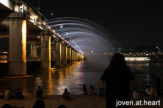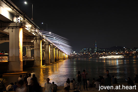 I was looking for places to hang along Han River and I found out that there’s a fountain show that happens every night at Banpo Bridge all year round (I think). The show times varies depending on the season. I was there in time to watch the 8.00 pm (KST) one.
